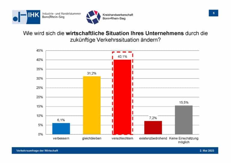 Die Umfrage zeigt auch, dass 40 Prozent der Unternehmen aufgrund der Verkehrslage künftig eine Verschlechterung ihrer wirtschaftlichen Situation befürchten.